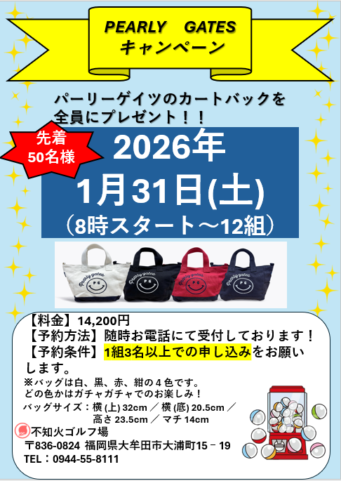 パーリーゲイツカートバッグキャンペーン開催のご案内 2025/12/05 2026年1月31日(土)に パーリーゲイツのカートバッグキャンペーンを開催します!! 先着50名様に、カートバッグをプレゼントします。 詳細は画像をご確認ください。 ご予約はお電話にて承っております。 ご予約お待ちしております!!
